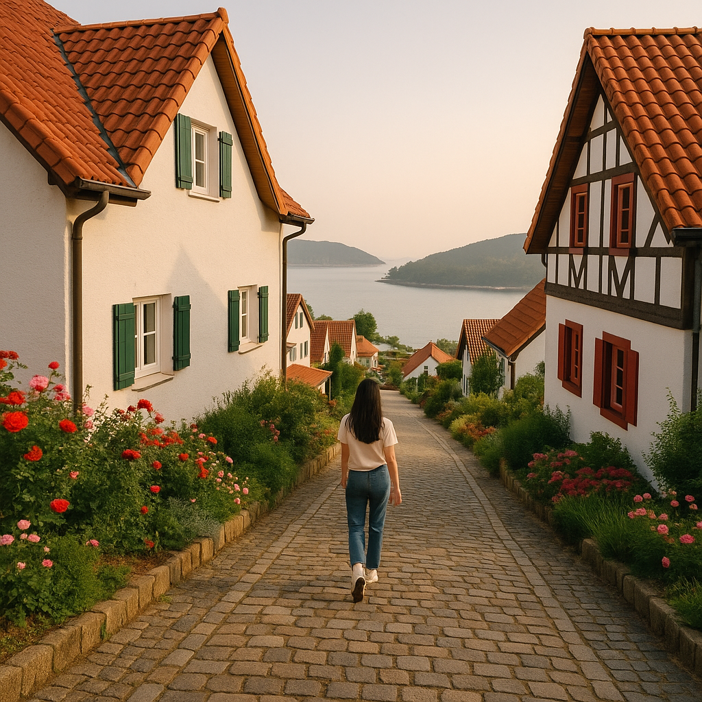 붉은 지붕과 흰 벽의 독일식 주택이 늘어선 이국적인 풍경이 특징입니다