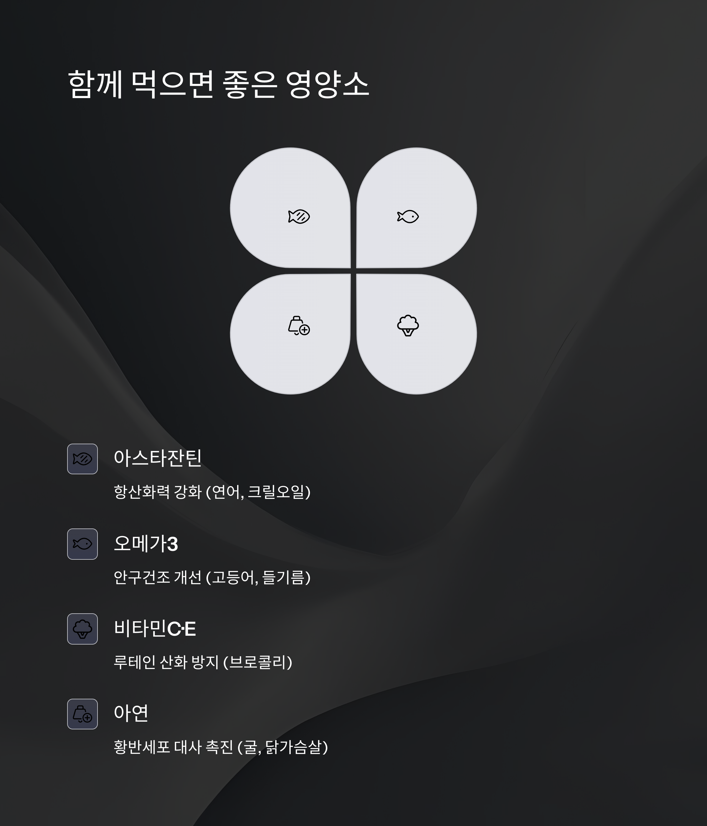 | 아스타잔틴 | 항산화력 강화 | 연어, 크릴오일 |