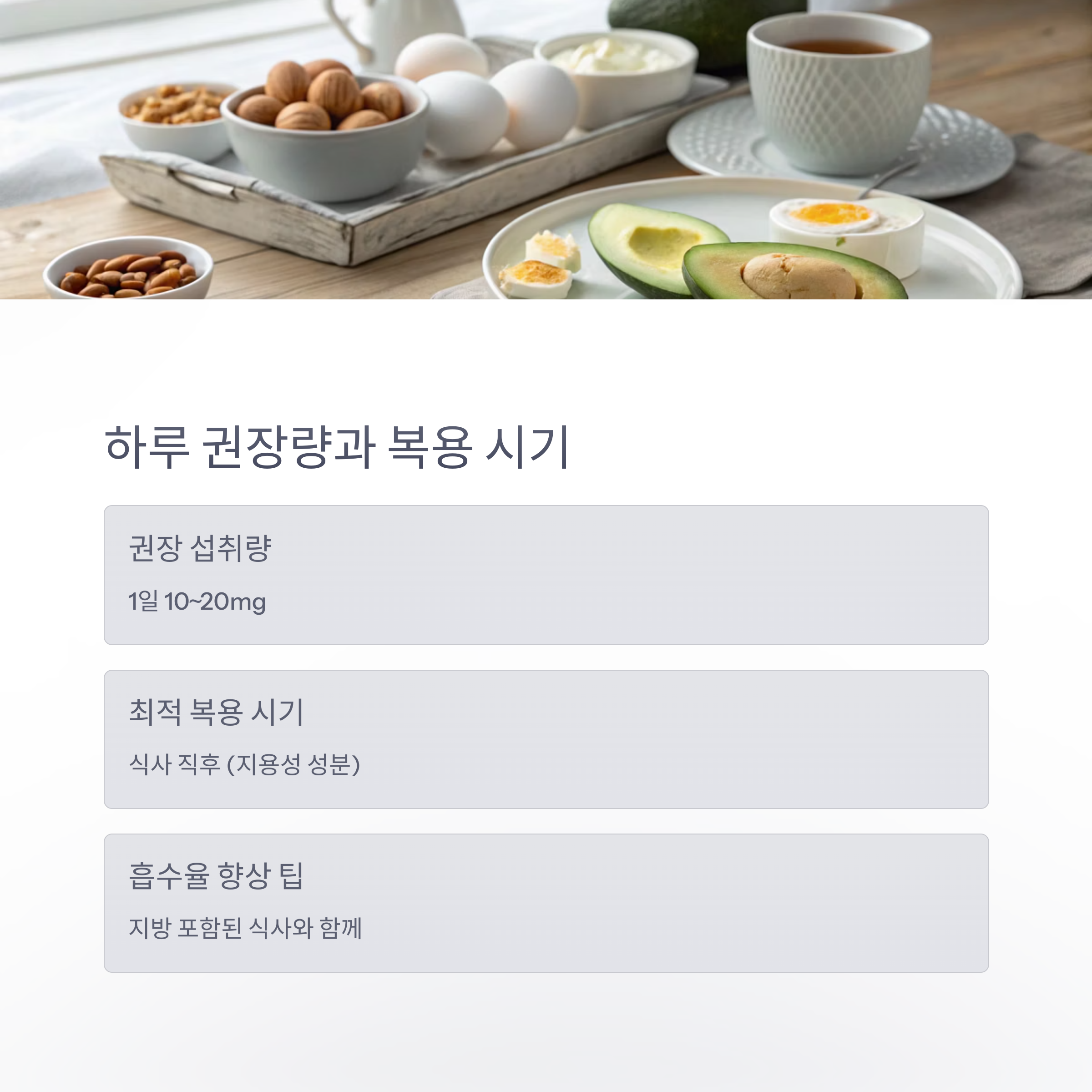 | 흡수율 향상 | 지방이 포함된 식사와 함께 먹기 |