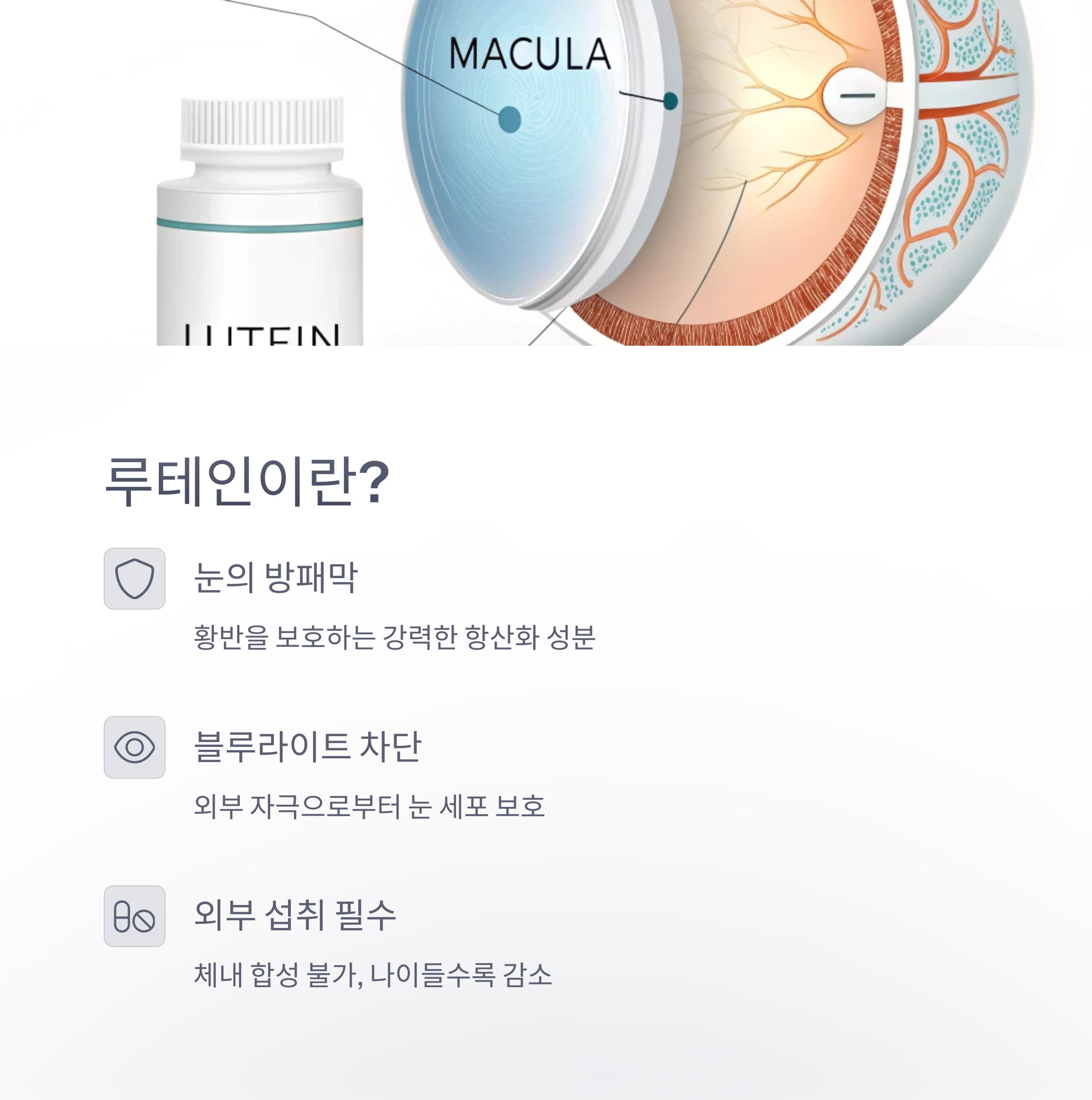 루테인은 눈의 중심 시력에 중요한 역할을 하는 황반을 보호하는 항산화 성분입니다