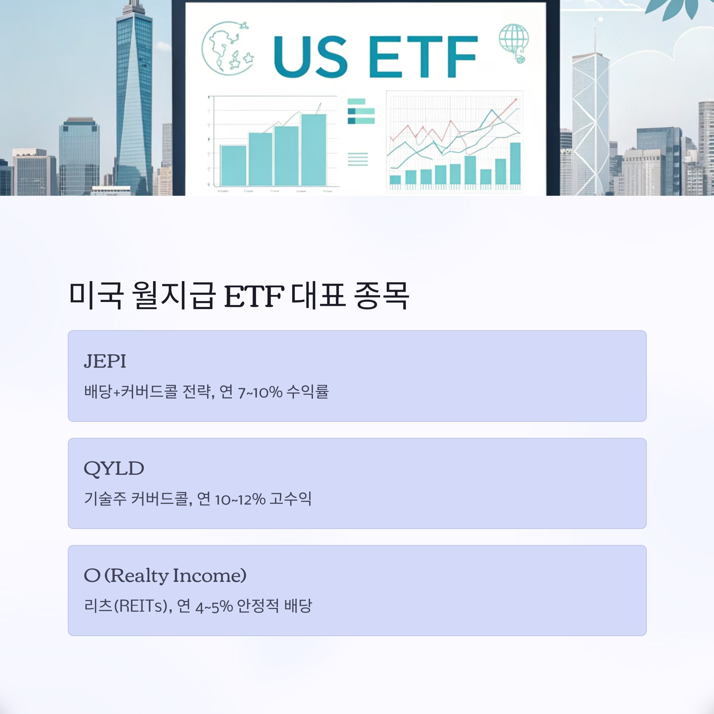 | JEPI | JPMorgan Equity Premium Income | 배당+커버드콜 전략 | 약 7~10% |