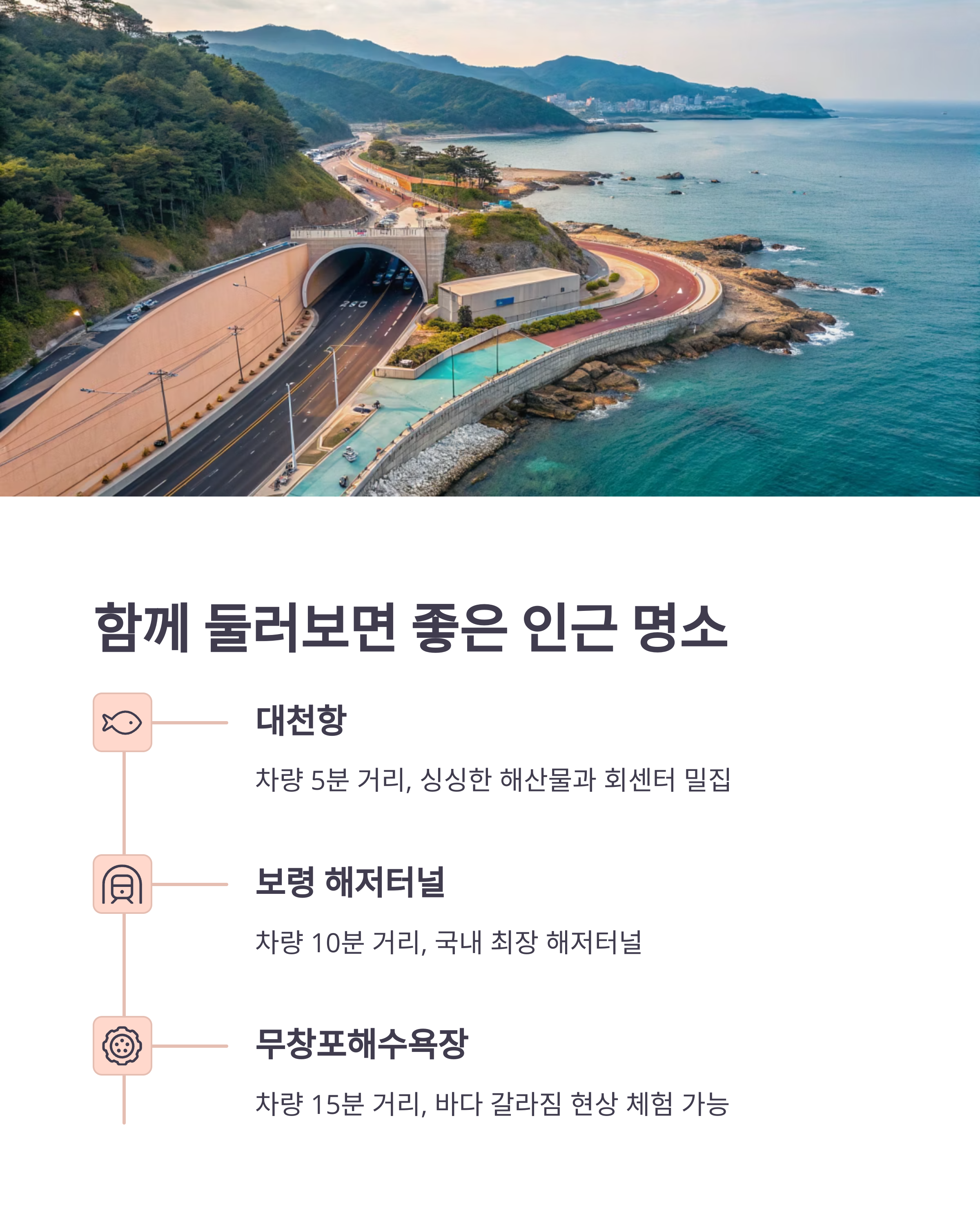 | 보령 해저터널 | 차량 10분 | 대천~원산도 잇는 국내 최장 해저터널 |