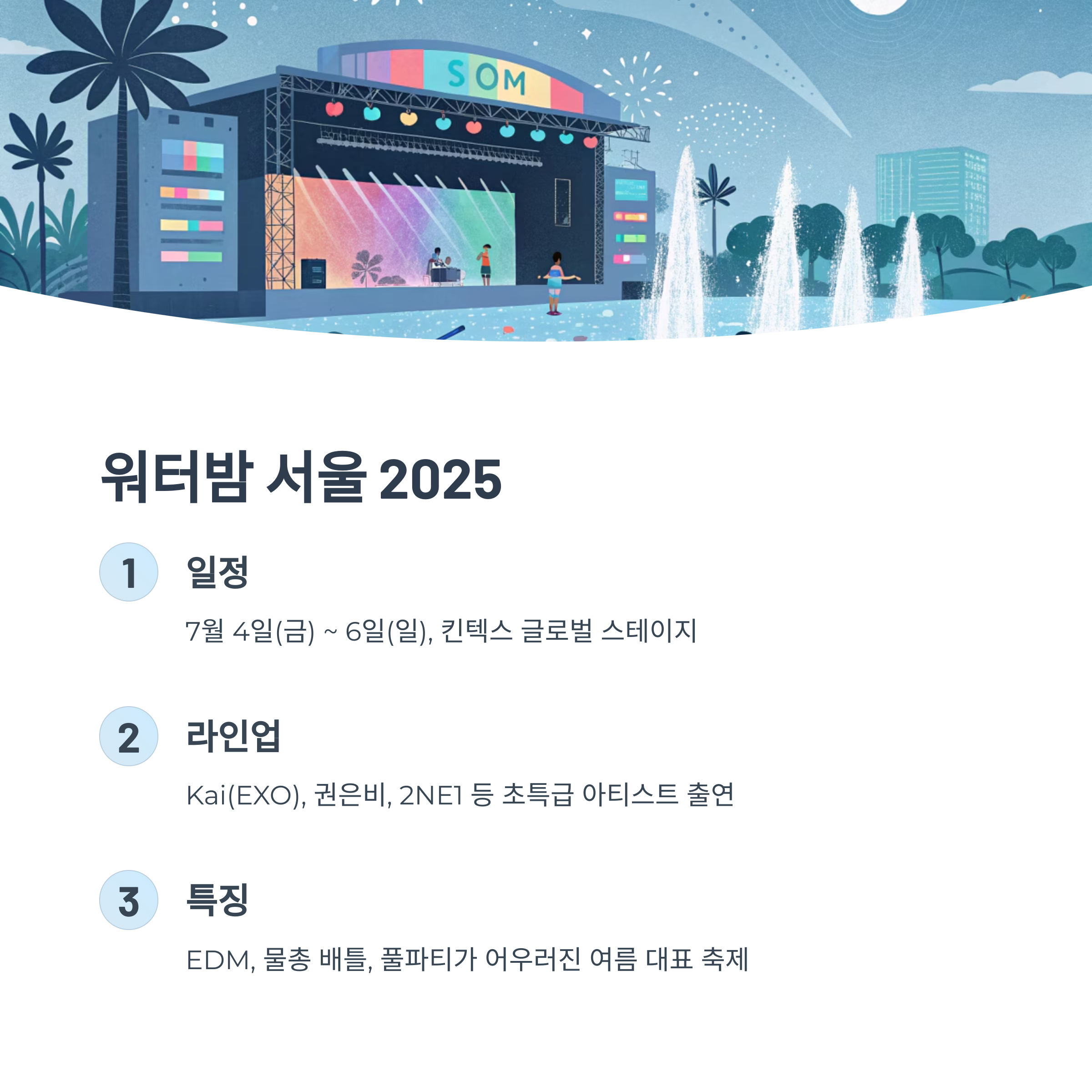 | 7/4~6 | 워터밤 서울 | 킨텍스 야외 | EDM·물놀이·K-POP |