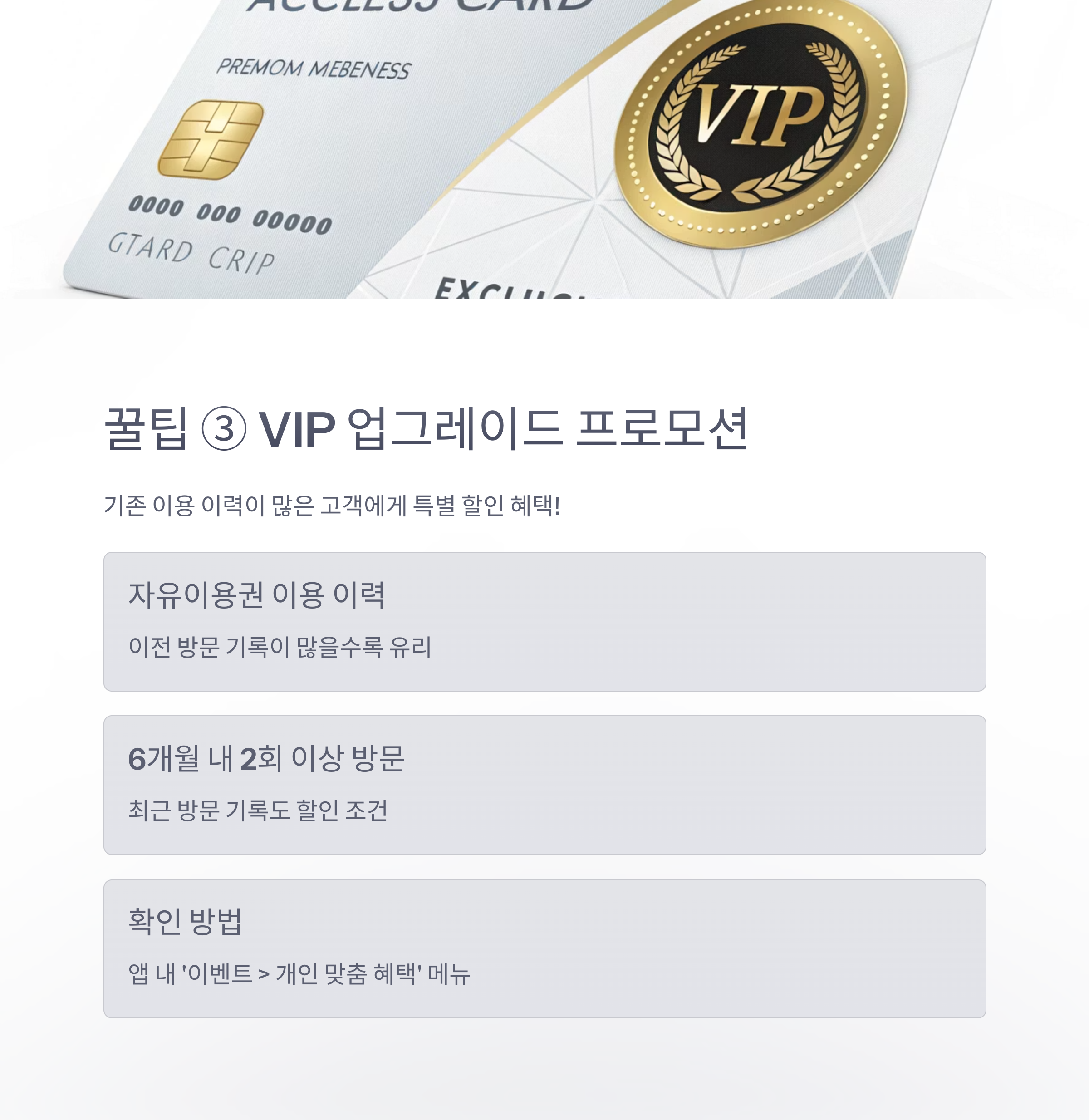 타임세일 시즌을 노리는 것도 큰 절약 방법입니다. 특히 3월, 6월, 11월은 성수기를 앞두고 다양한 할인 이벤트가 몰리는 시기입니다. 앱 알림을 켜두면 타이밍을 놓치지 않고 빠르게 정보를 받을 수 있으며 카드사별 프로모션과 병행하면 할인 폭이 더욱 커집니다. 실제로 타임세일과 제휴 할인 중복 적용으로 연간회원권을 30% 가까이 저렴하게 구매한 사례도 있습니다.