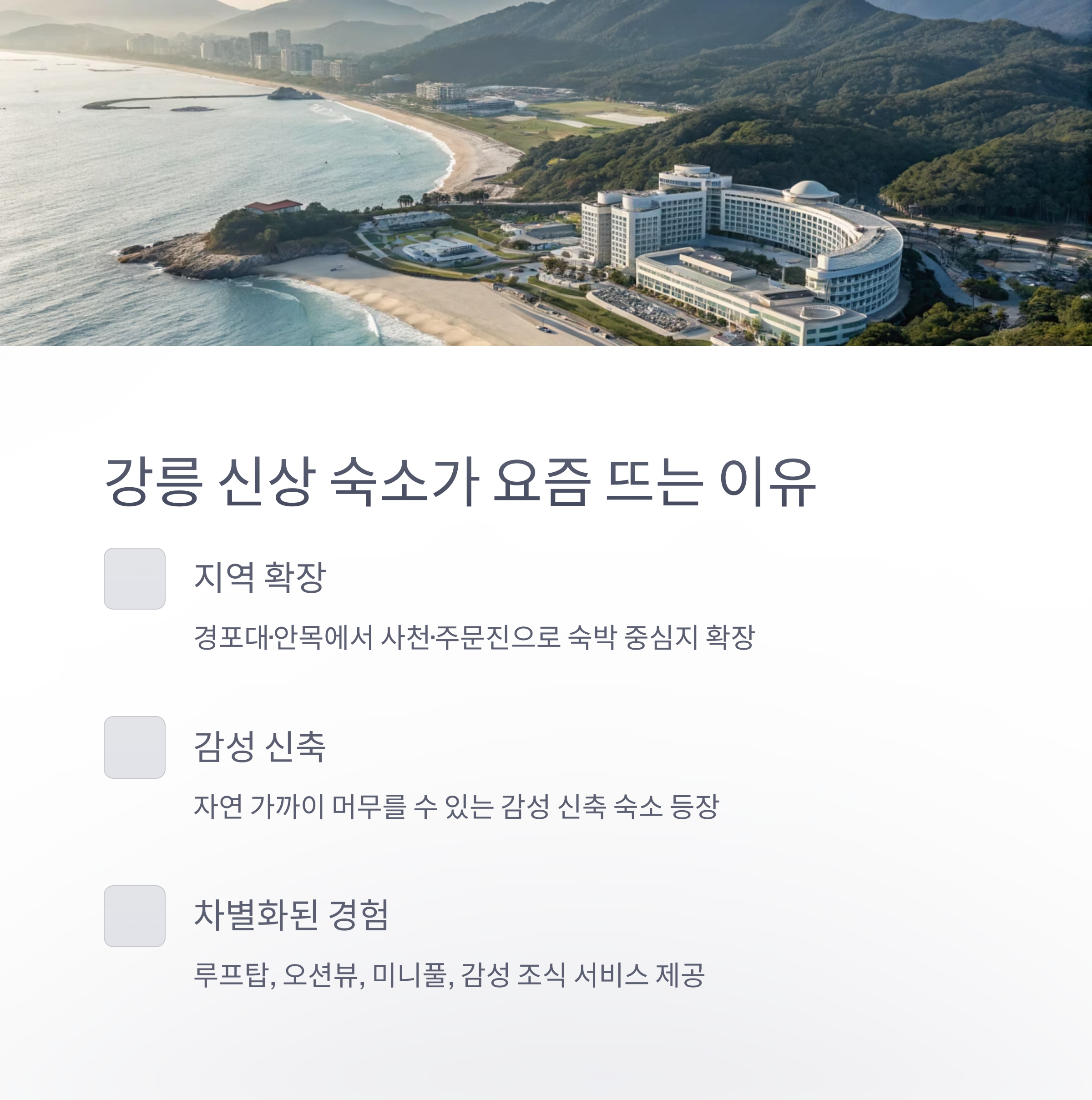 결론 – 강릉 신상 숙소는 ‘체험형 감성 숙소’로 진화 중