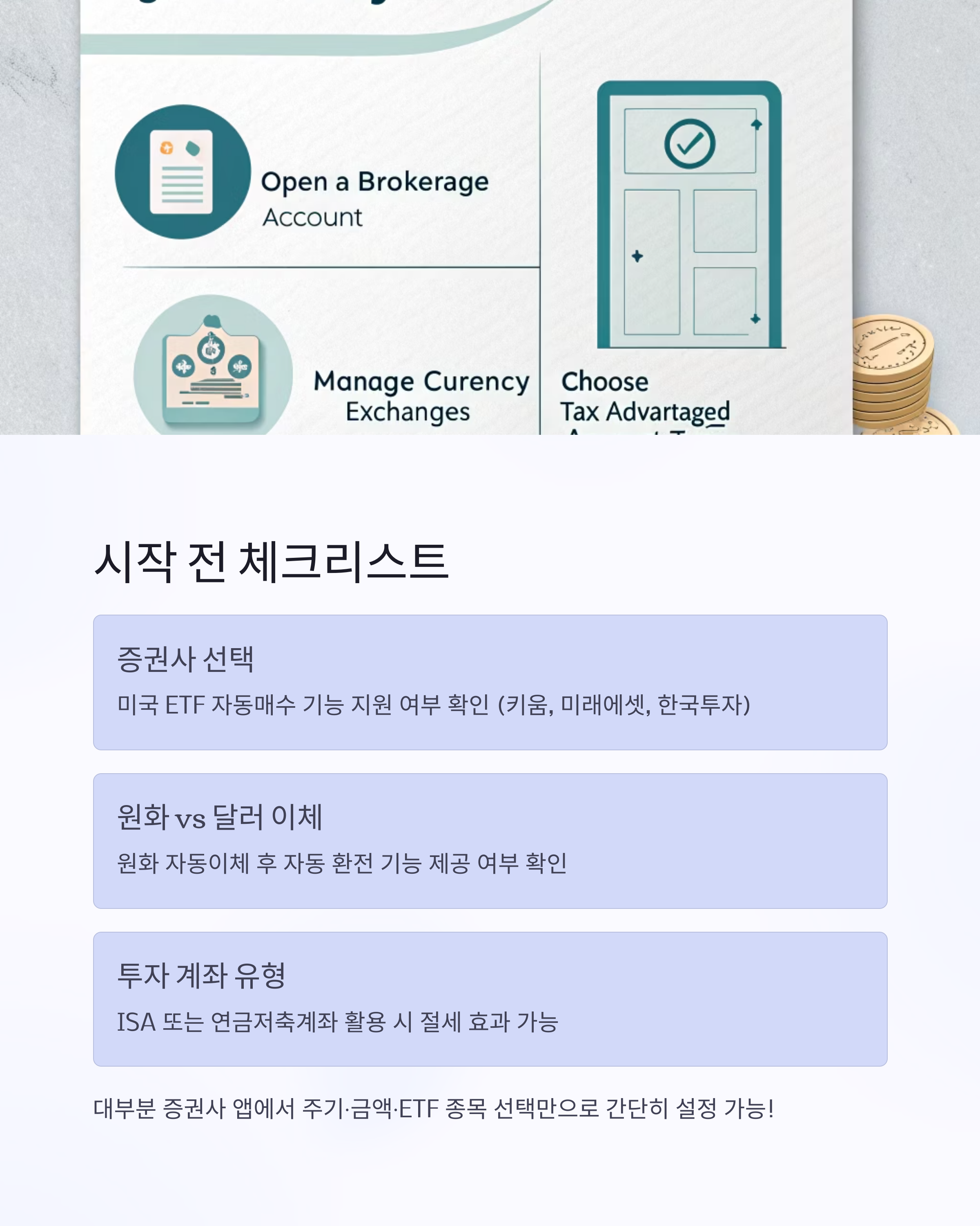 | 증권사 선택 | 미국 ETF 자동매수 기능 지원 여부 확인 (예: 키움, 미래에셋, 한국투자) |
