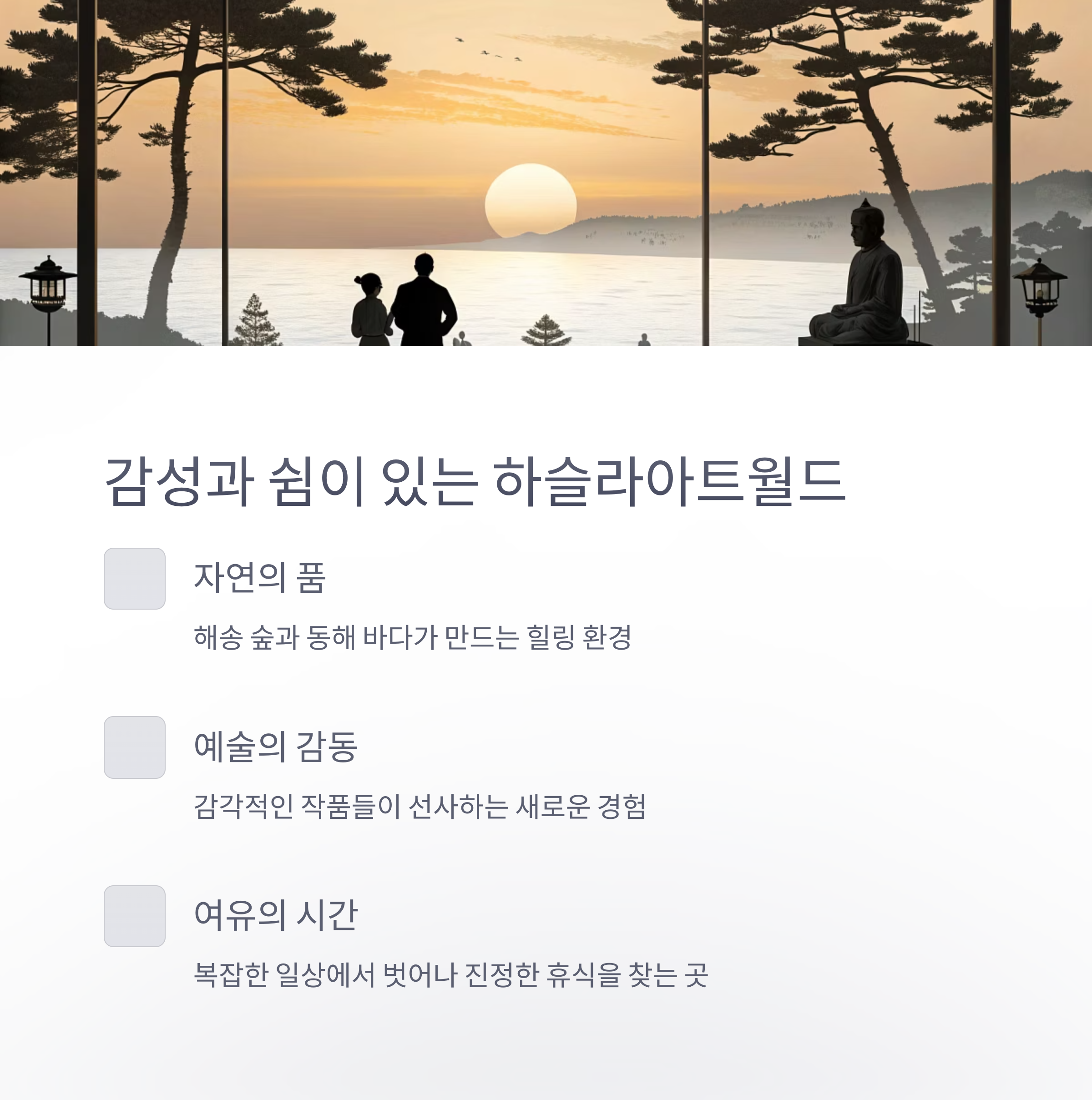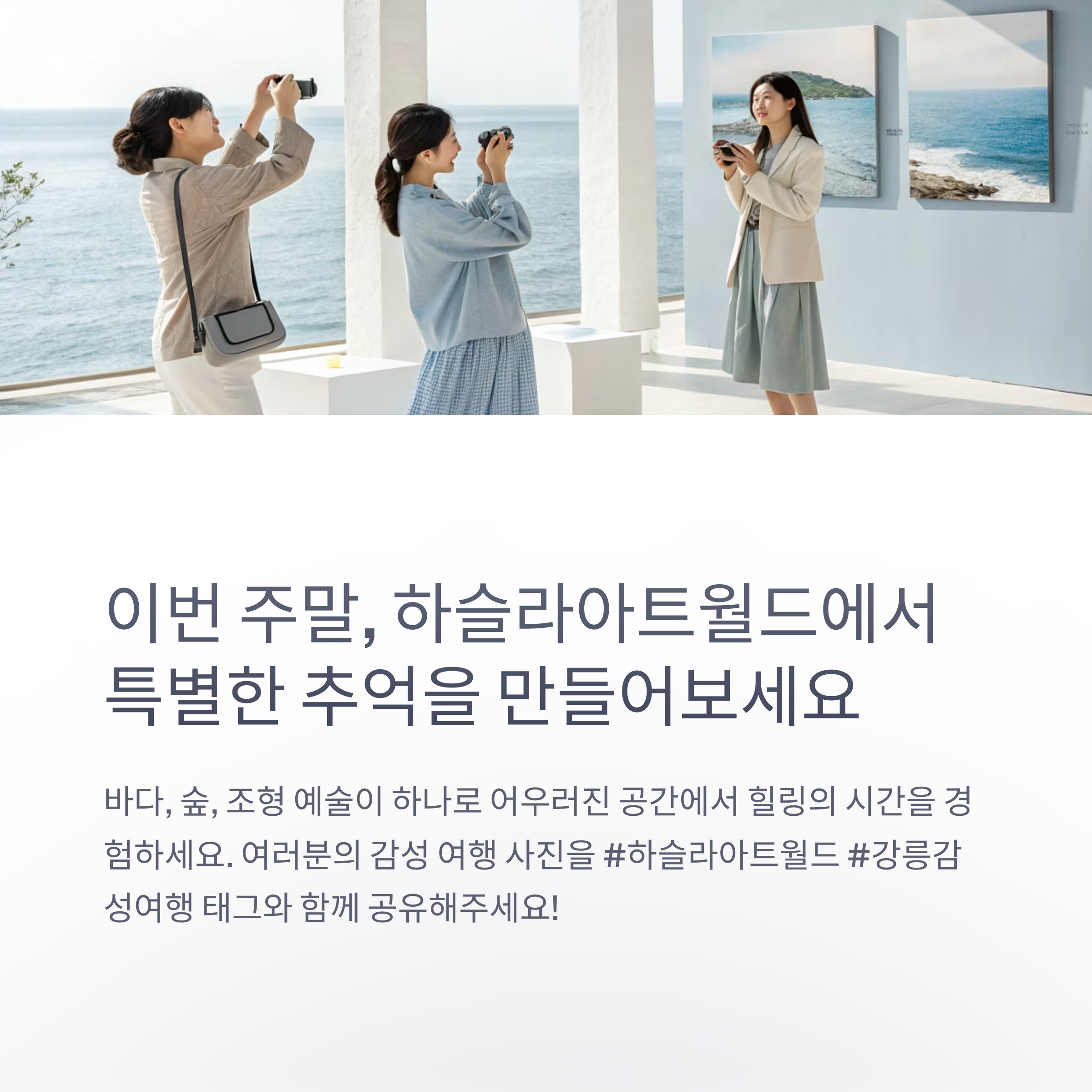 강릉 하슬라아트월드는 바다와 예술, 숲과 산책이 어우러지는 특별한 힐링 여행지입니다. 도시의 소음과 복잡함에서 벗어나 자연과 감성을 채울 수 있는 공간을 찾고 있다면, 이번 주말 하슬라아트월드에서 하루를 보내보세요. 혼자만의 여유 있는 사색도, 연인과의 데이트도, 아이들과의 나들이도 모두 어울리는 이곳에서 기억에 남을 감성 충전 여행이 완성될 것입니다.