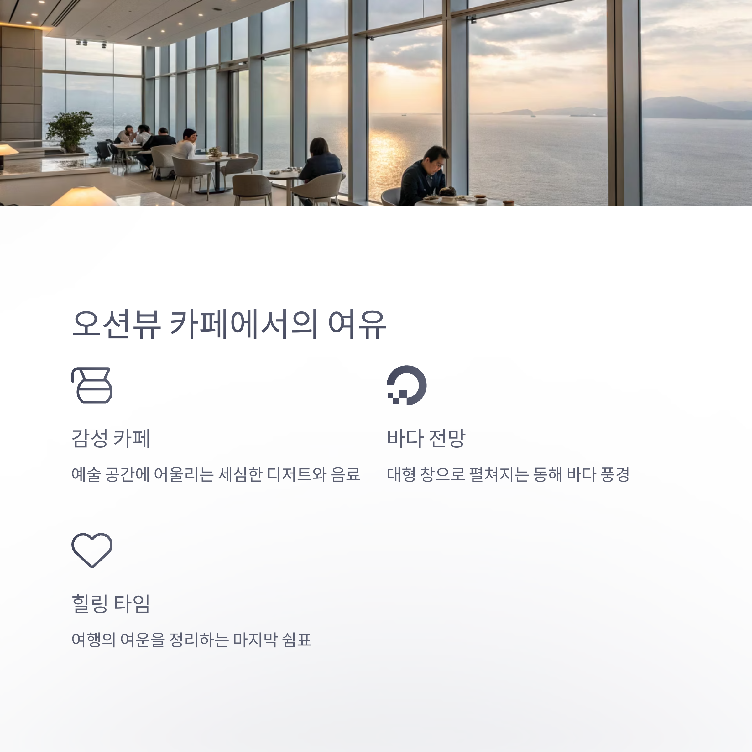 | 자연과 예술이 조화를 이루는 복합 예술 공간 | 바다 풍경과 전시를 동시에 즐길 수 있는 공간 | 반나절~하루 일정으로도 충분한 만족감 |