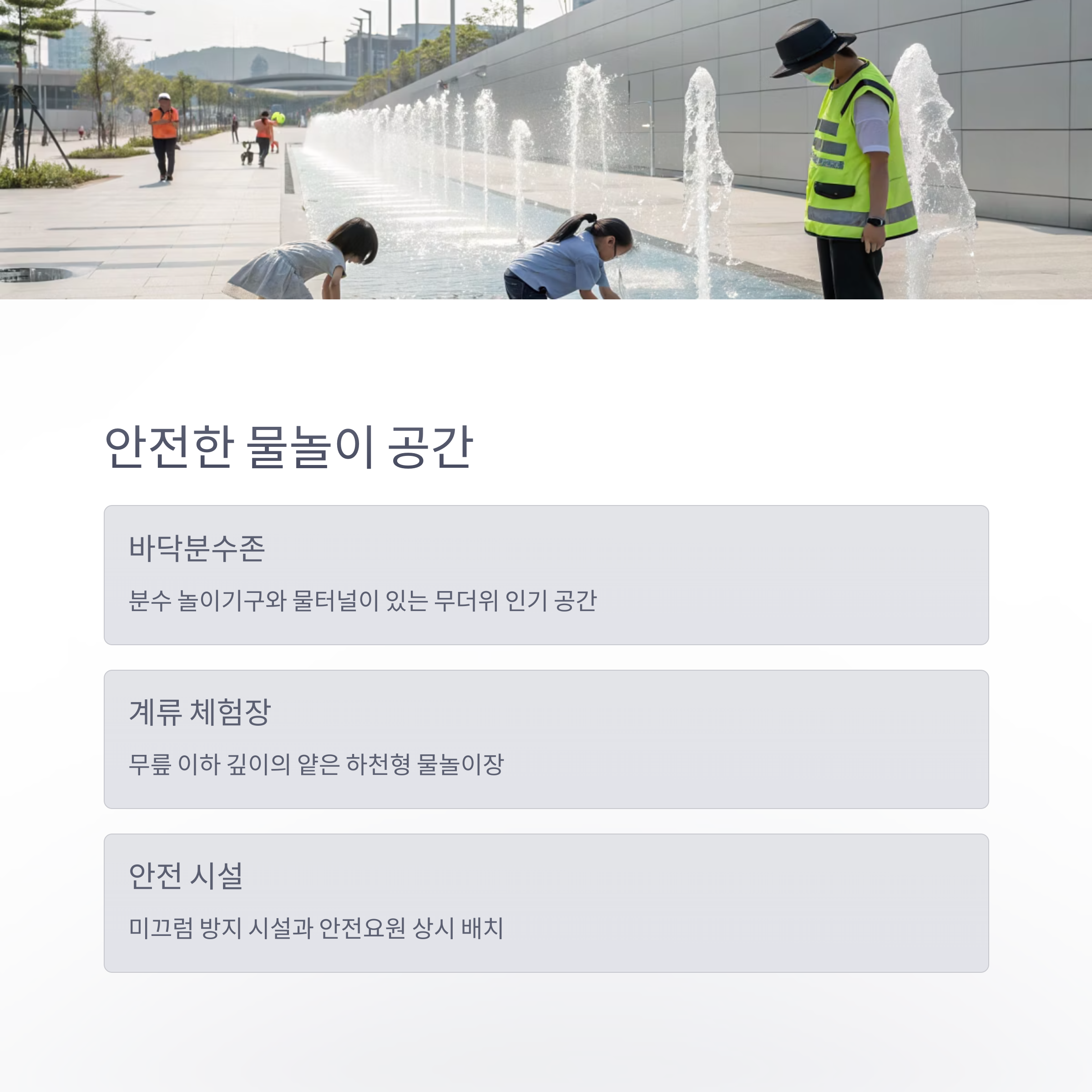 | 이천시 창전동 복하천 일대 | 여름철 5월~9월 (10:00~17:00 운영) | 3세 이상 유아부터 초등학생 가족 |