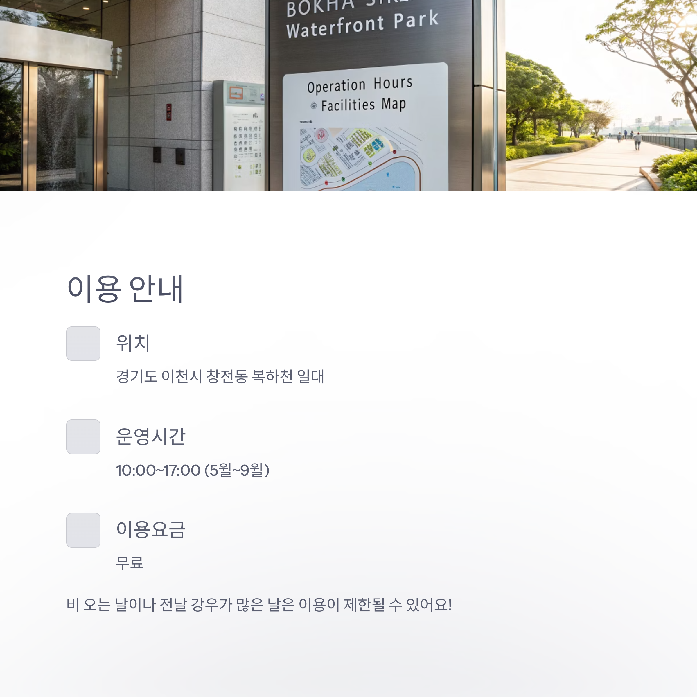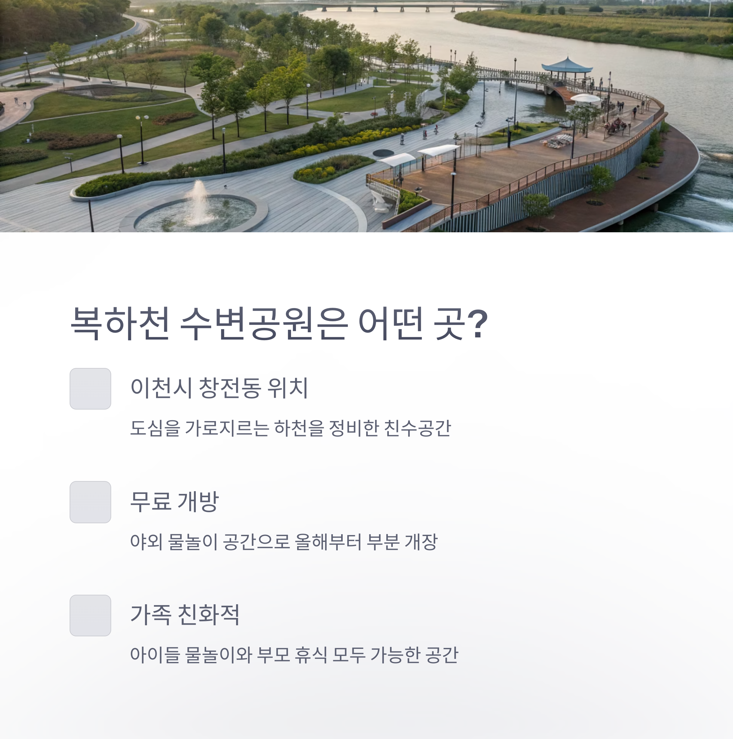 | 위치 | 경기도 이천시 창전동 복하천 일대에 위치한 친수형 수변공원 |