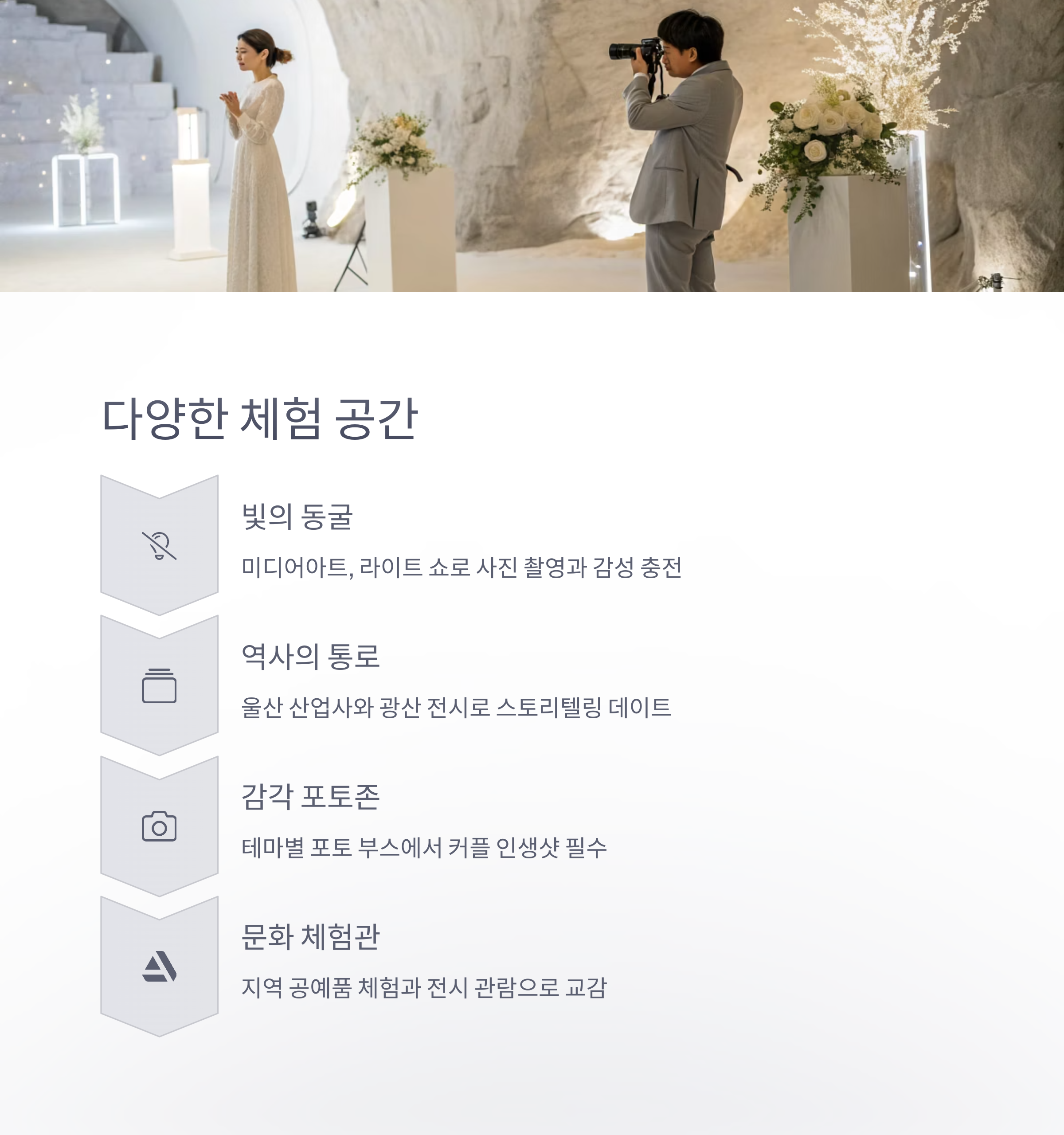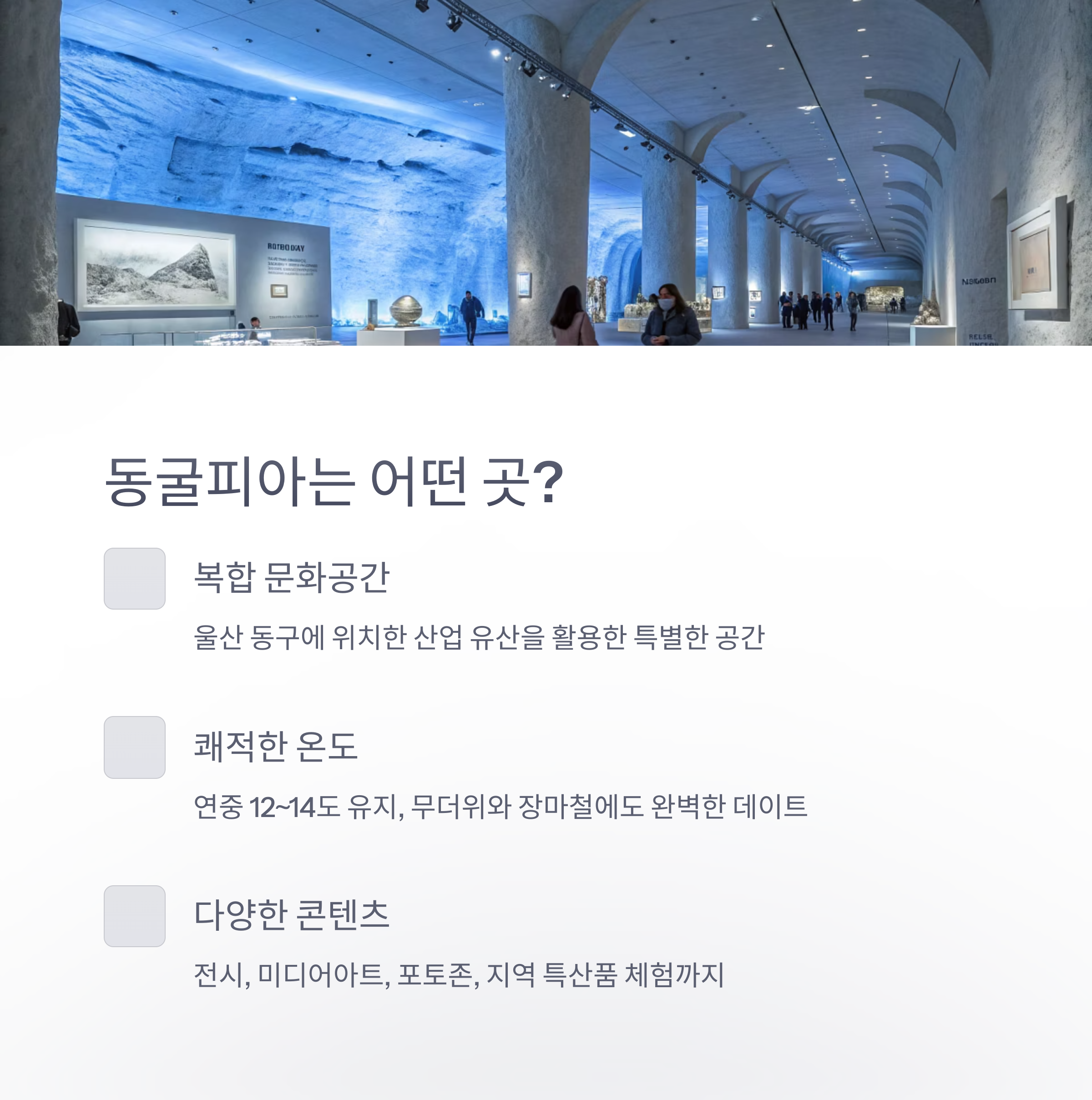 울산 동굴피아는 동구에 위치한 산업 유산을 활용한 복합 문화공간입니다. 한여름 무더위도 피하고, 비 오는 날에도 눈치 보지 않고 놀 수 있는 완벽한 실내 데이트 코스로 최근 2030 커플 사이에서 특히 주목받고 있습니다. 전시, 미디어아트, 포토존, 지역 특산품 체험존까지 다양한 콘텐츠가 마련되어 있어 단순한 관람이 아닌 '경험하는 데이트'가 가능합니다.
