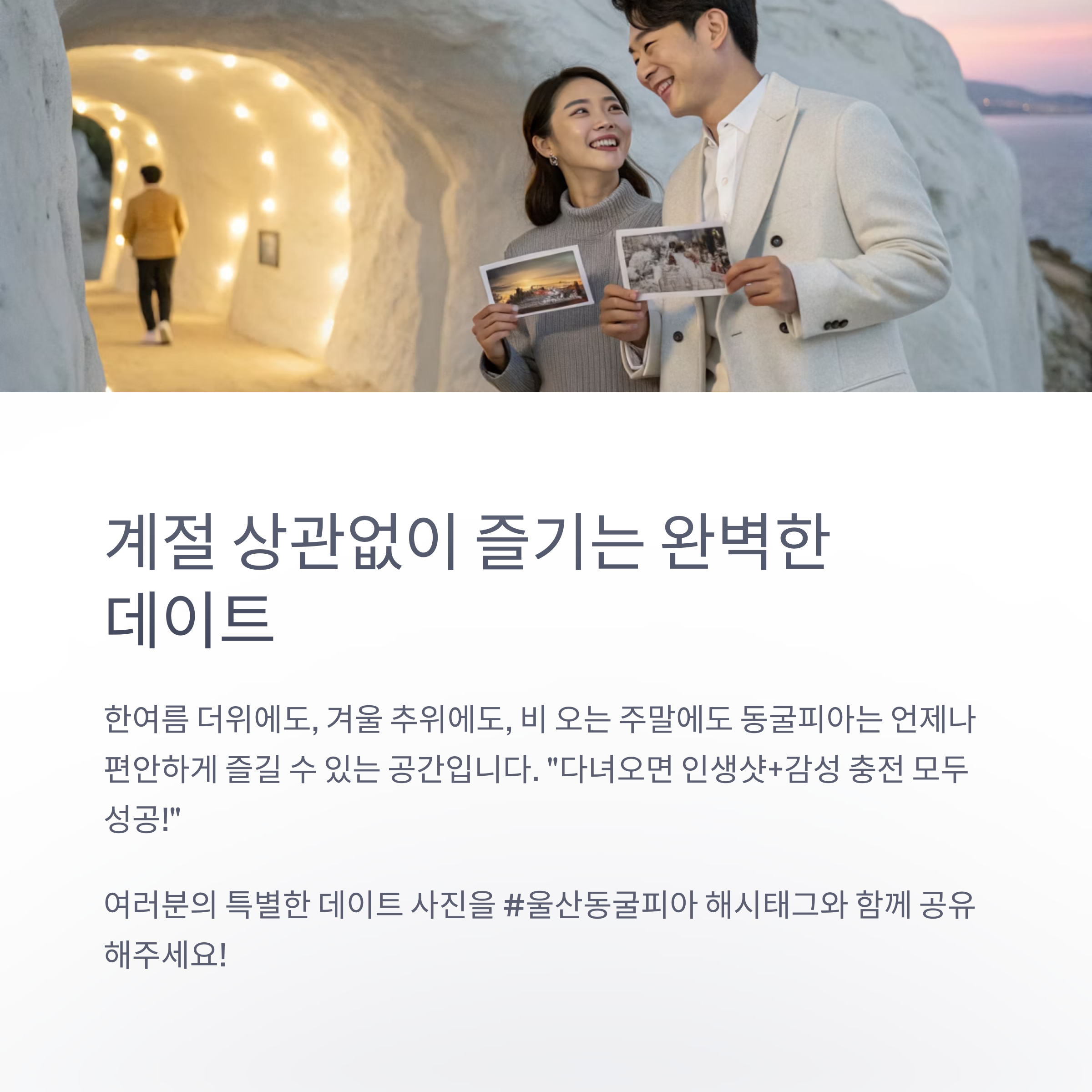 비 오는 날, 더운 여름날에도 완벽한 실내 데이트를 찾고 있다면 요즘 SNS에서 핫하게 떠오르는 울산 '동굴피아'가 정답입니다. 미디어 아트와 시원한 동굴 체험까지 모두 가능한 이색 공간에서 데이트의 감성을 제대로 느껴보세요.