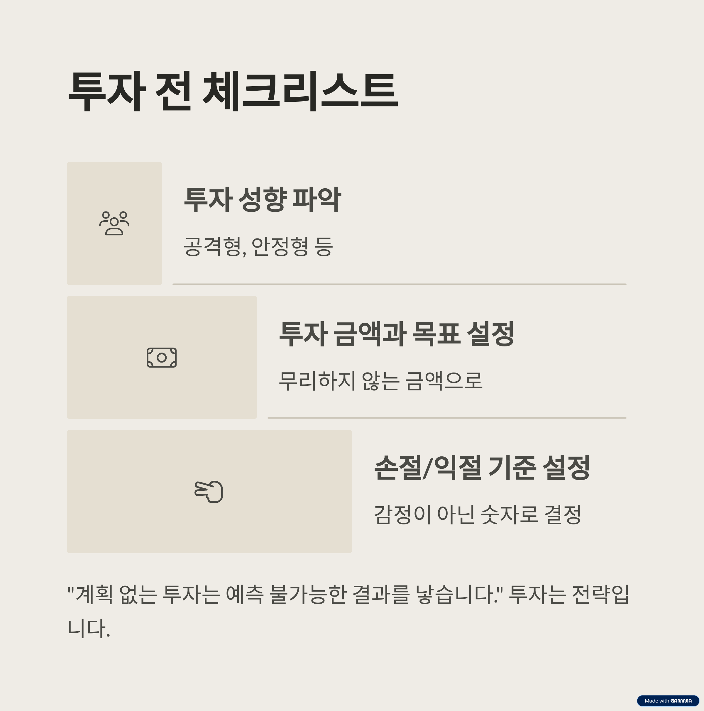 "계획 없는 투자는 예측 불가능한 결과를 낳습니다"