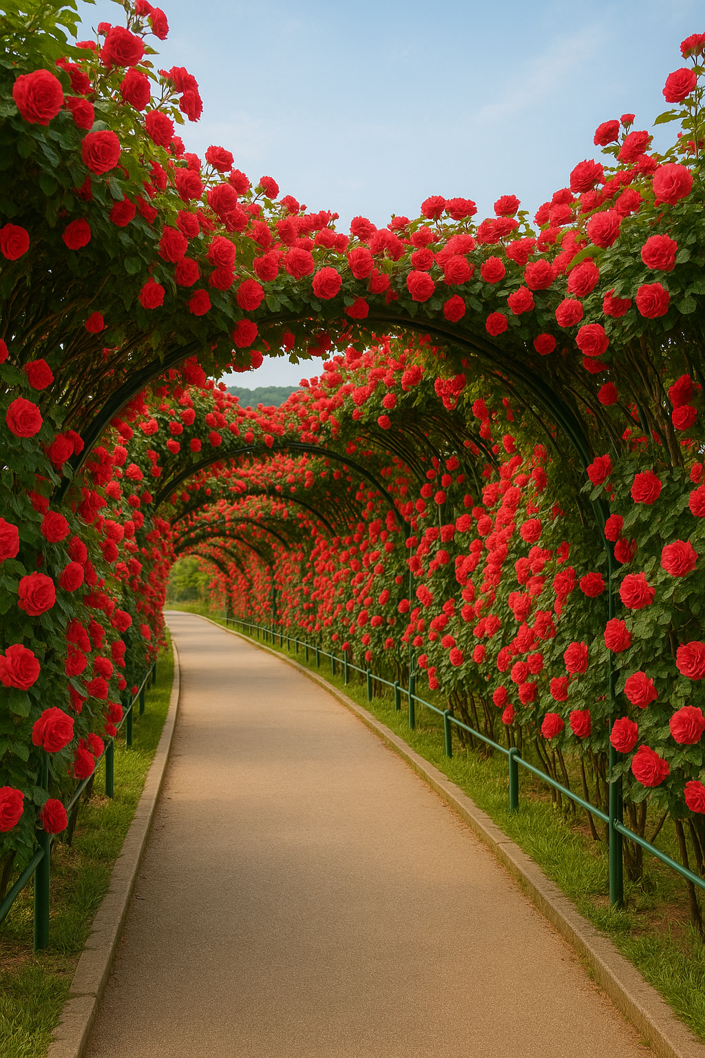 수천 송이의 붉은, 분홍, 흰 장미가 곡선형 아치 위에 흐드러지게 피어 있는 공간입니다