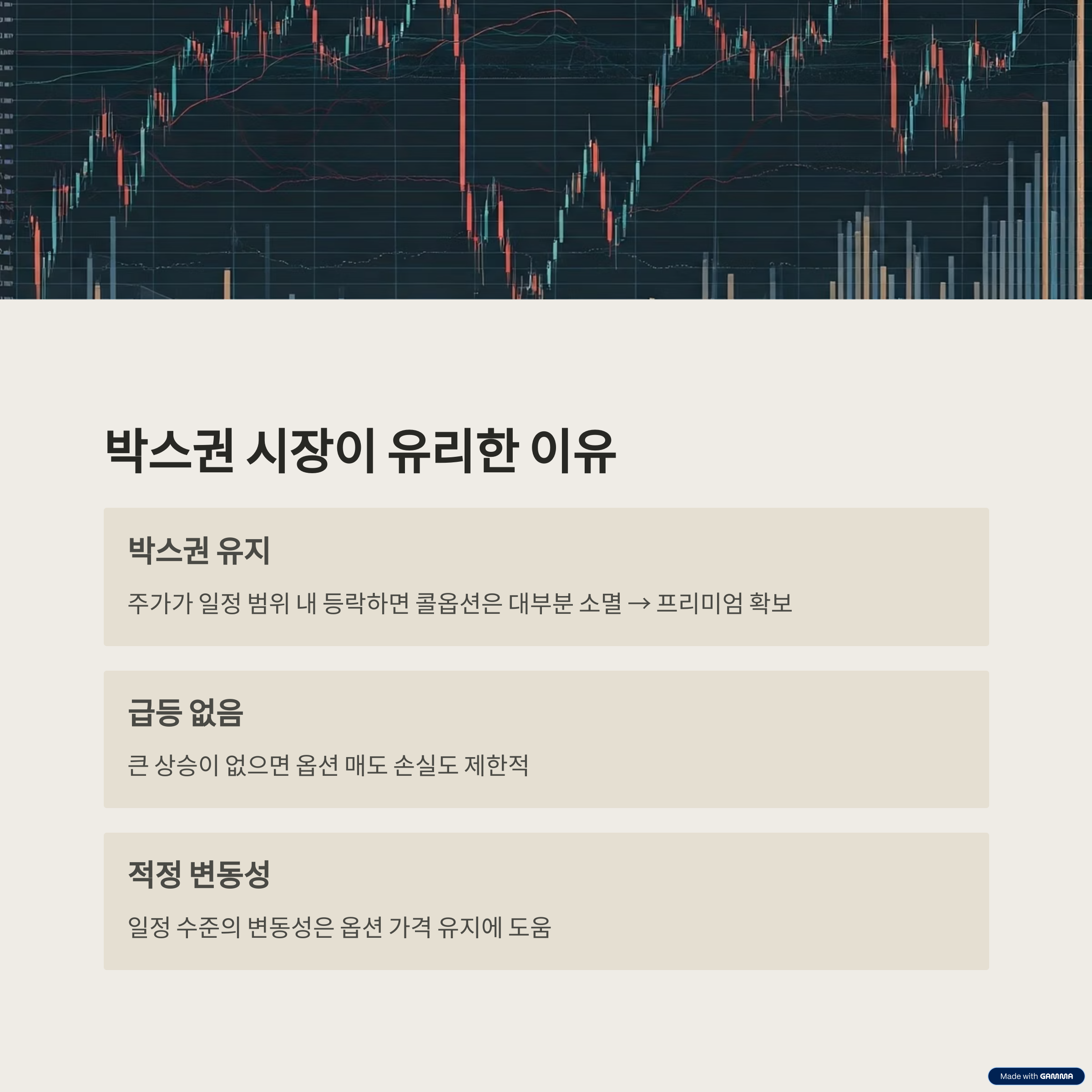 | 박스권 유지 | 주가가 일정 범위 내 등락하면 콜옵션은 대부분 소멸 → 프리미엄 확보 가능 |
