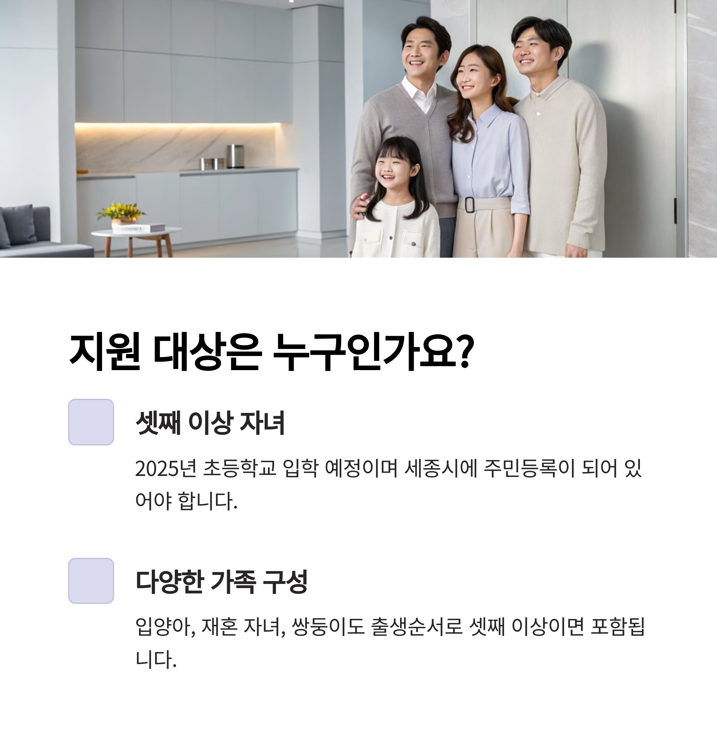 | 지원대상 요건 | 세종시 거주 + 2025년 초1 입학 + 셋째 이상 자녀 |