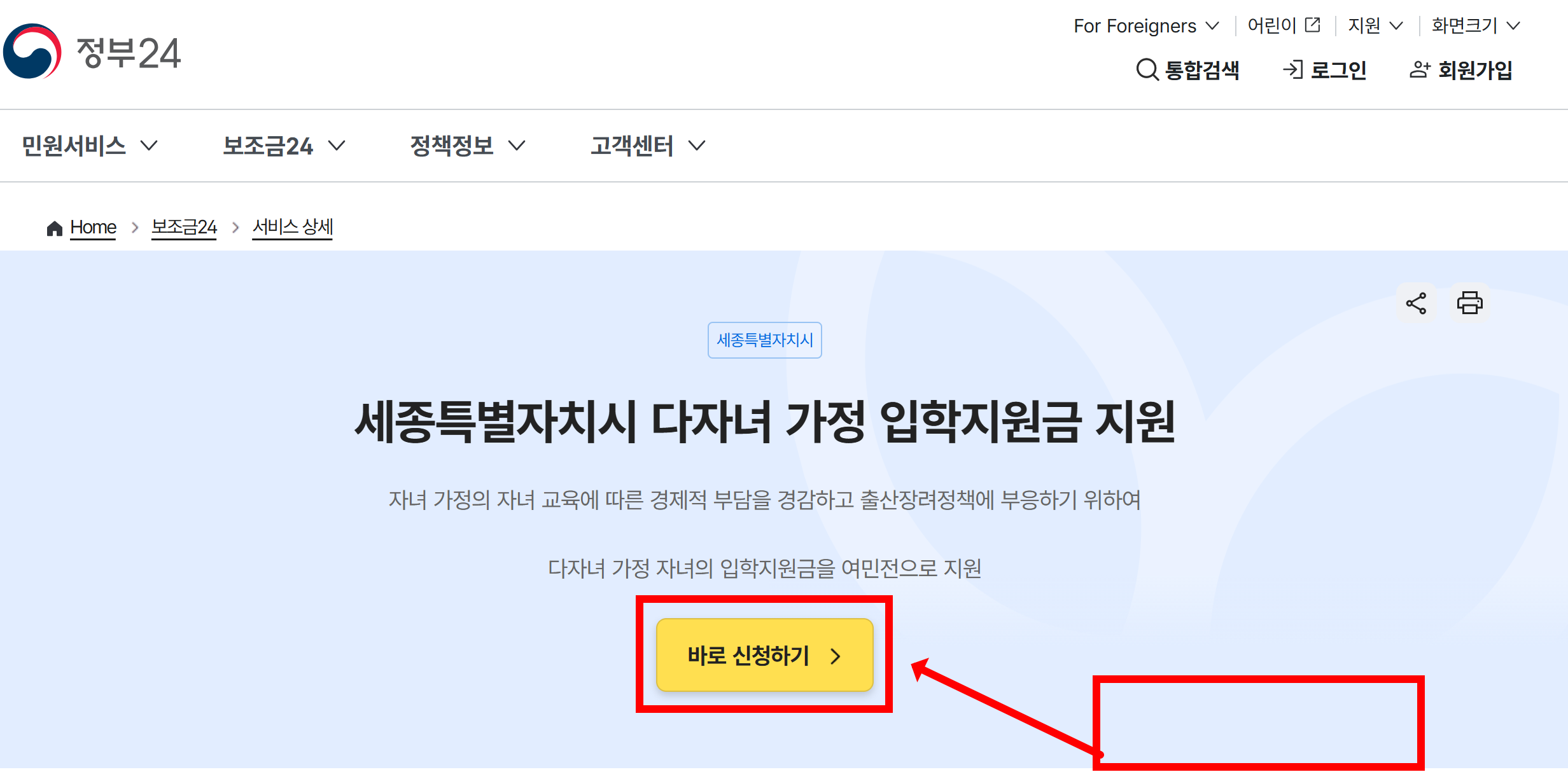 지원대상 요건 세종시 거주 + 2025년 초1 입학 + 셋째 이상 자녀
