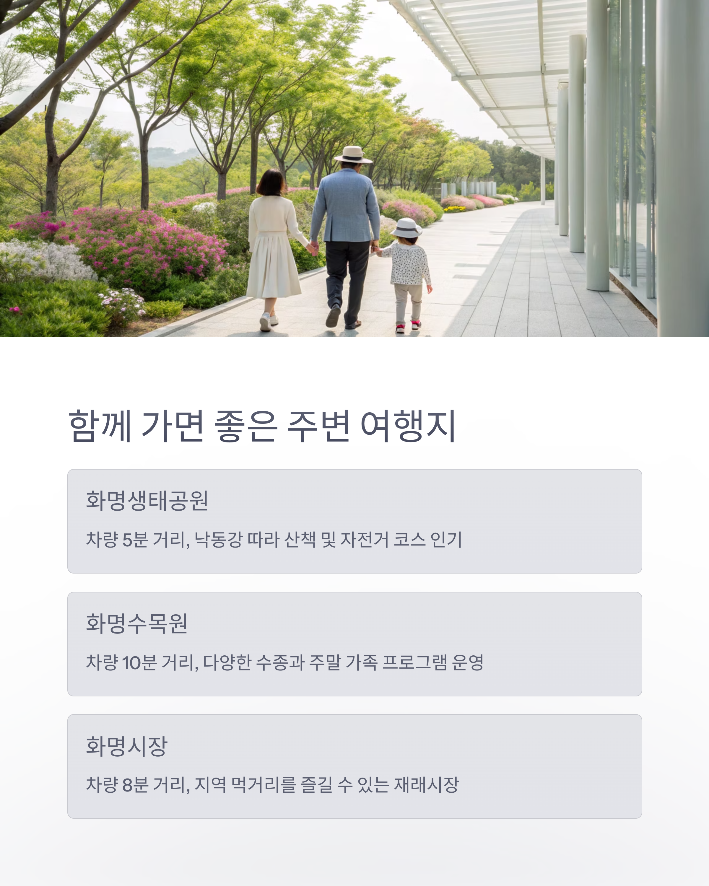 | 화명수목원 | 차량 10분 | 다양한 수종과 포토존, 주말 가족 프로그램 운영 |