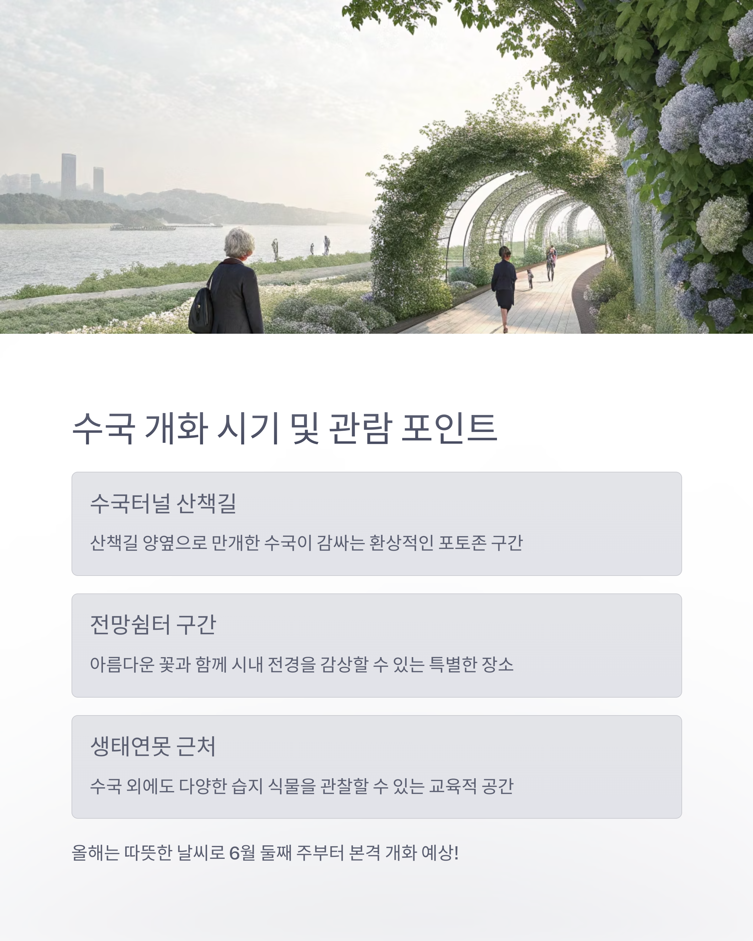 | 수국터널 산책길 | 양옆으로 만개한 수국이 감싸는 포토존 구간 | 6월 중순~하순 |