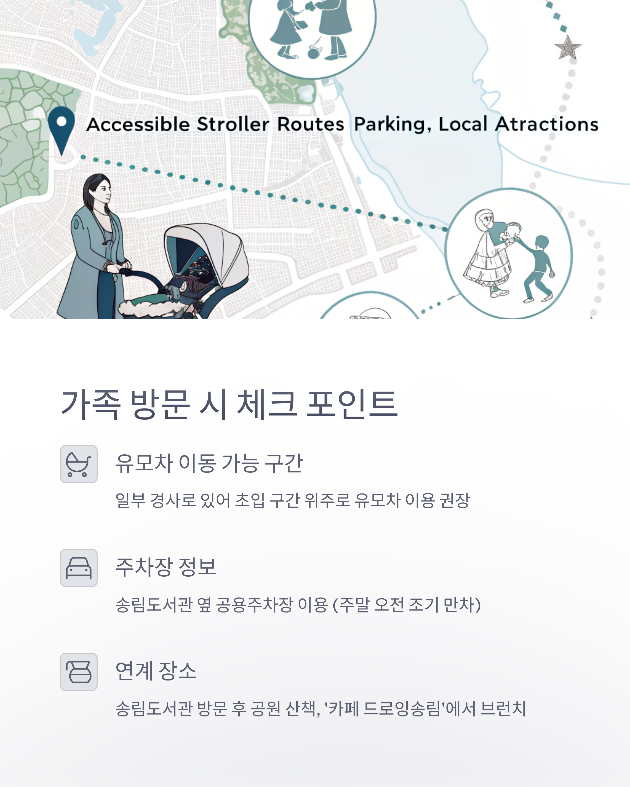 송림도서관 옆 공용주차장 활용 (주말 오전 조기 만차 주의) - 도서관, 카페 등 연계 장소 추천
