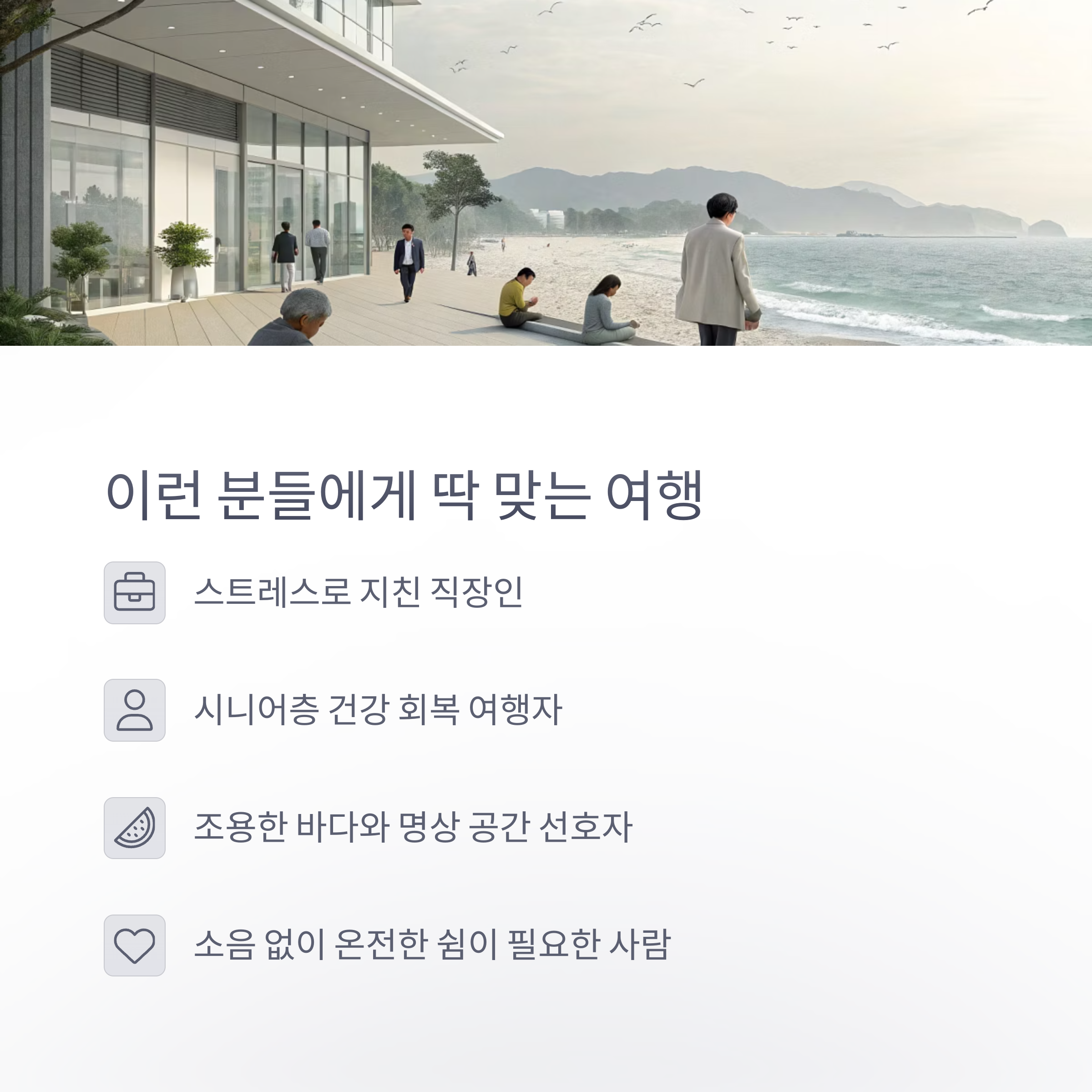 스트레스를 많이 받는 직장인, 신체 피로를 느끼는 시니어, 조용한 여행지를 선호하는 분들에게 특히 적합합니다.