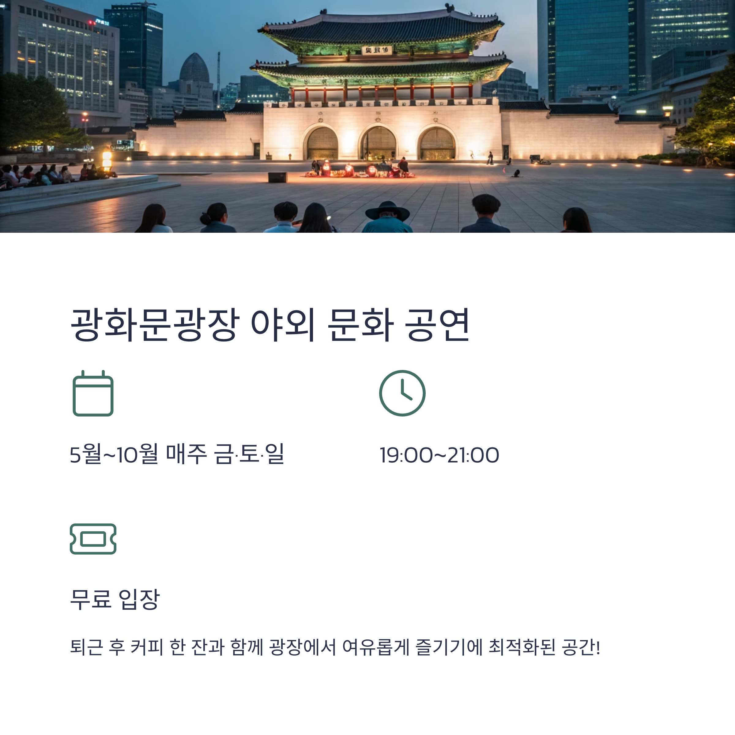 | 광화문광장 | 19:00~21:00 | 무료공연, 도심 힐링 |