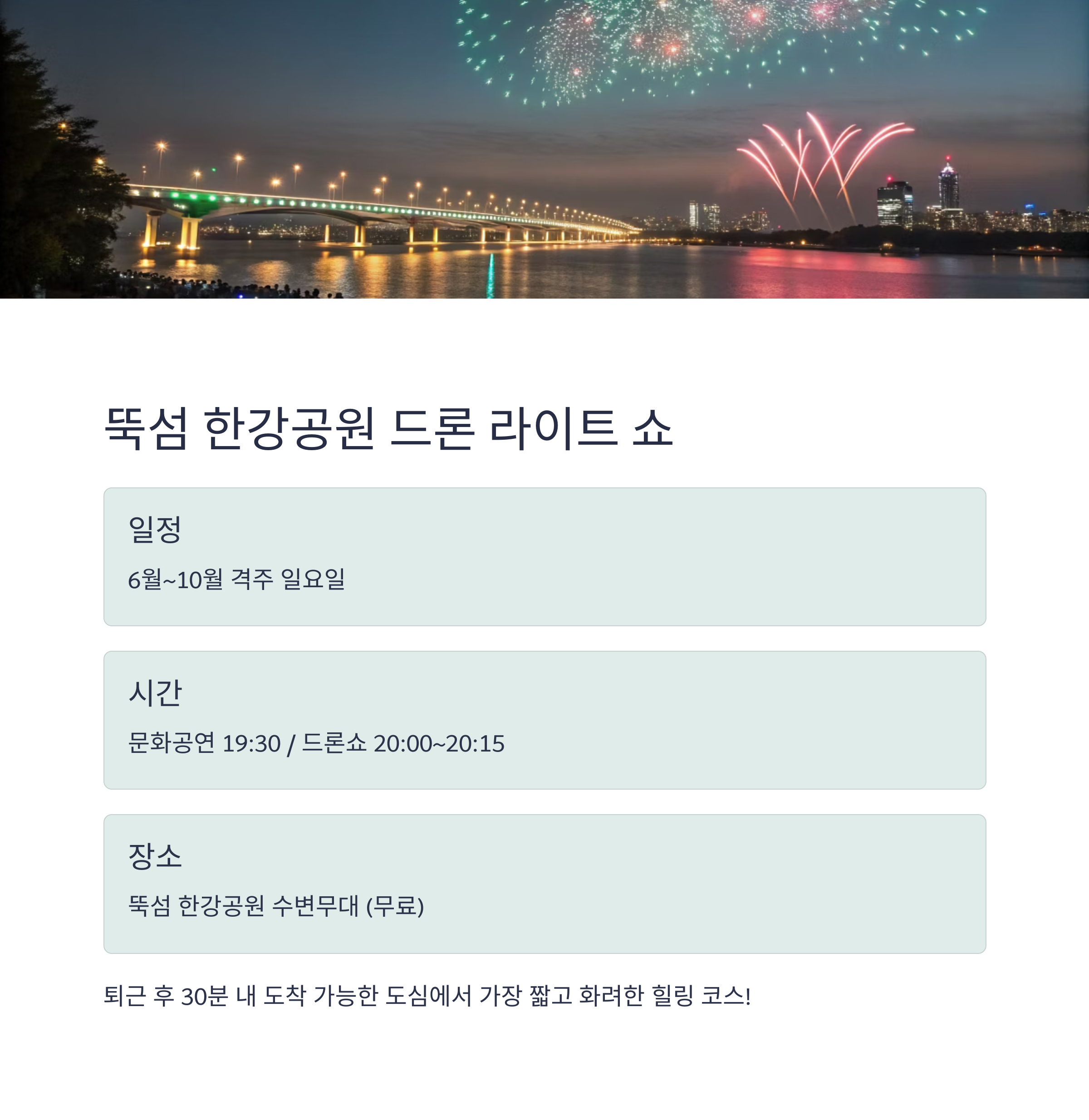 한강에서의 드론쇼, 도심 속 야시장, 조용한 독서 공간까지